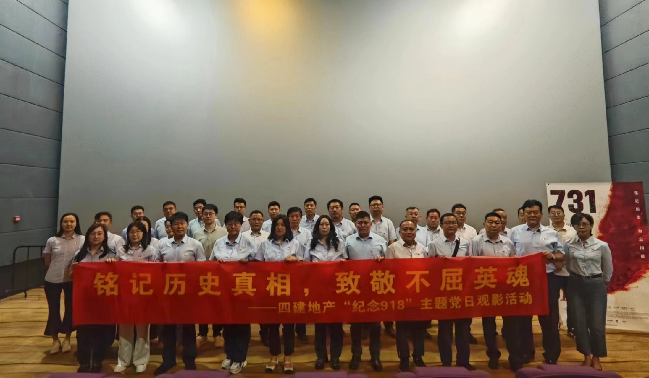 2025年9月18日下午,在“九一八事变”94周年之际,为践行社会主义核心价值观、弘扬爱国主义精神,在四建地产副总经理、万盛物业总经理李勇的带领下,四建地产党支部组织全体党员、入党积极分子、青年员工代表,开展了“铭记历史真相,致敬不屈英魂”主题观影活动,共同观看爱国主义教育影片《731》。