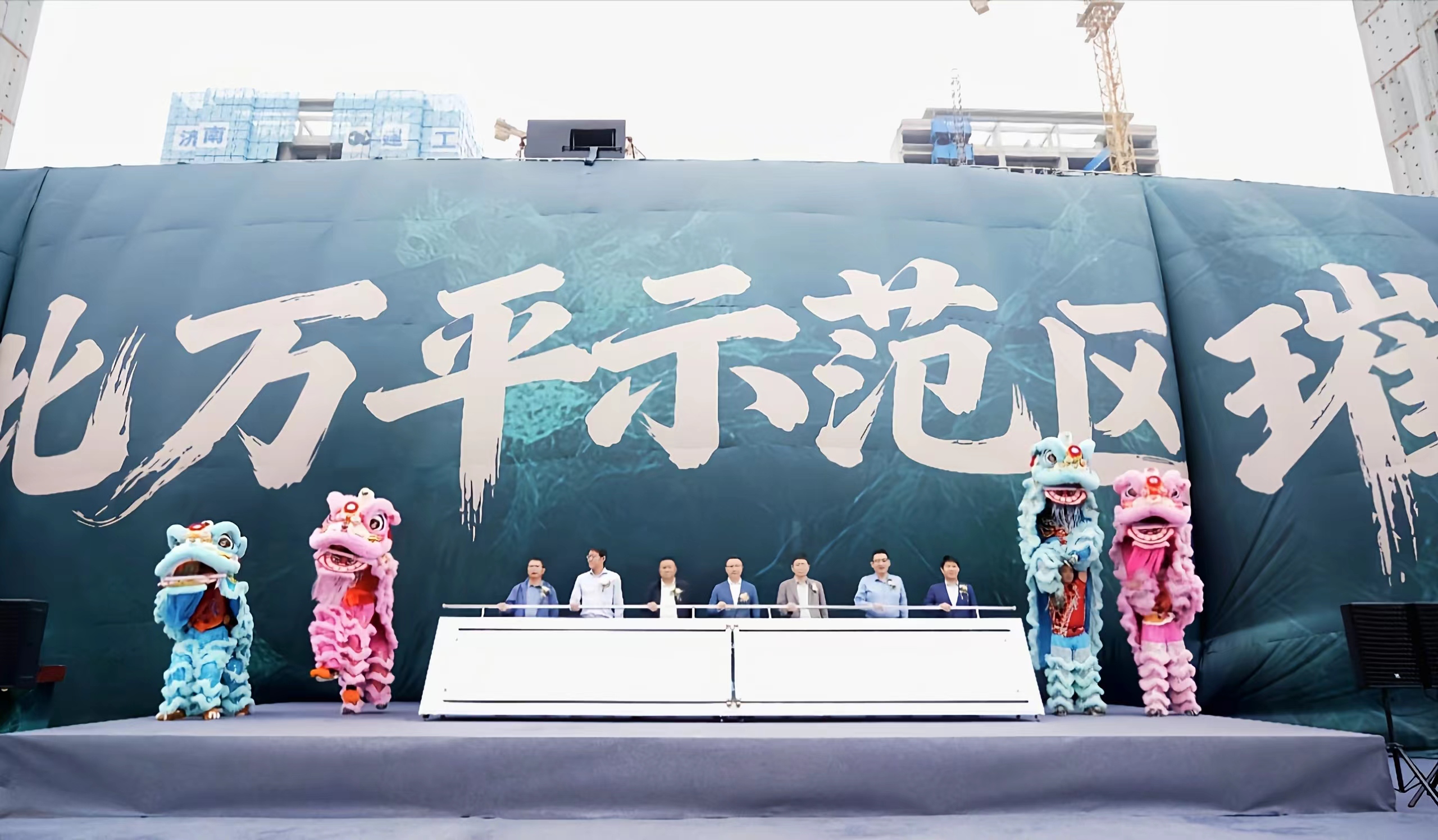 十点十分,祥瑞舞狮跃动登场,昂扬腾挪间,为项目注入吉祥寓意与勃勃生机,将现场氛围推向高潮。接着,在全场嘉宾的瞩目与倒数声中,张总携手多位领导共同推动启动杆,舞台吸幕瞬间升起,金海瑞园恢弘的大门豁然眼前,万平园林示范区的胜景也在此刻全景呈现,引来阵阵赞叹。同时,舞狮吐青,卷轴铺展,“责任国企,品质筑家;瑞境天成,盛启非凡”十六字宣言熠熠生辉,标志着金海瑞园万平园林示范区正式华彩绽放。最后,各位领导在舞台上合影留念,定格这一意义非凡的瞬间。